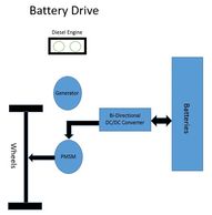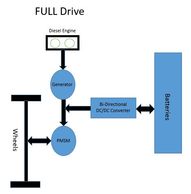In the Full-Drive Mode, the Drive energy comes from the Batteries as well as the ICE driven Generator. Note there are no mechanical linkages between the drive train and the ICE. Here again, the output of the Generator passes thru a FOC controller that condition its 3 phase outputs into a DC to supplement the needed energy to the Drive Traction Motor directly.