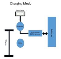 In the Charging Mode, the Internal Combustion Engine (ICE) would be running the Generator whose output is passed thru a Field Oriented Converter (FOC) then thru the Bi-Directional DC/DC controller to charge the batteries as necessary.