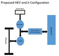 The Proposed HEV consists of the wheels, a PMSM linear motor with controller, a Bi-Directional DC/DC converter, The Batteries, a Generator that is driven by a two cylinders Diesel engine for extended driving distances.